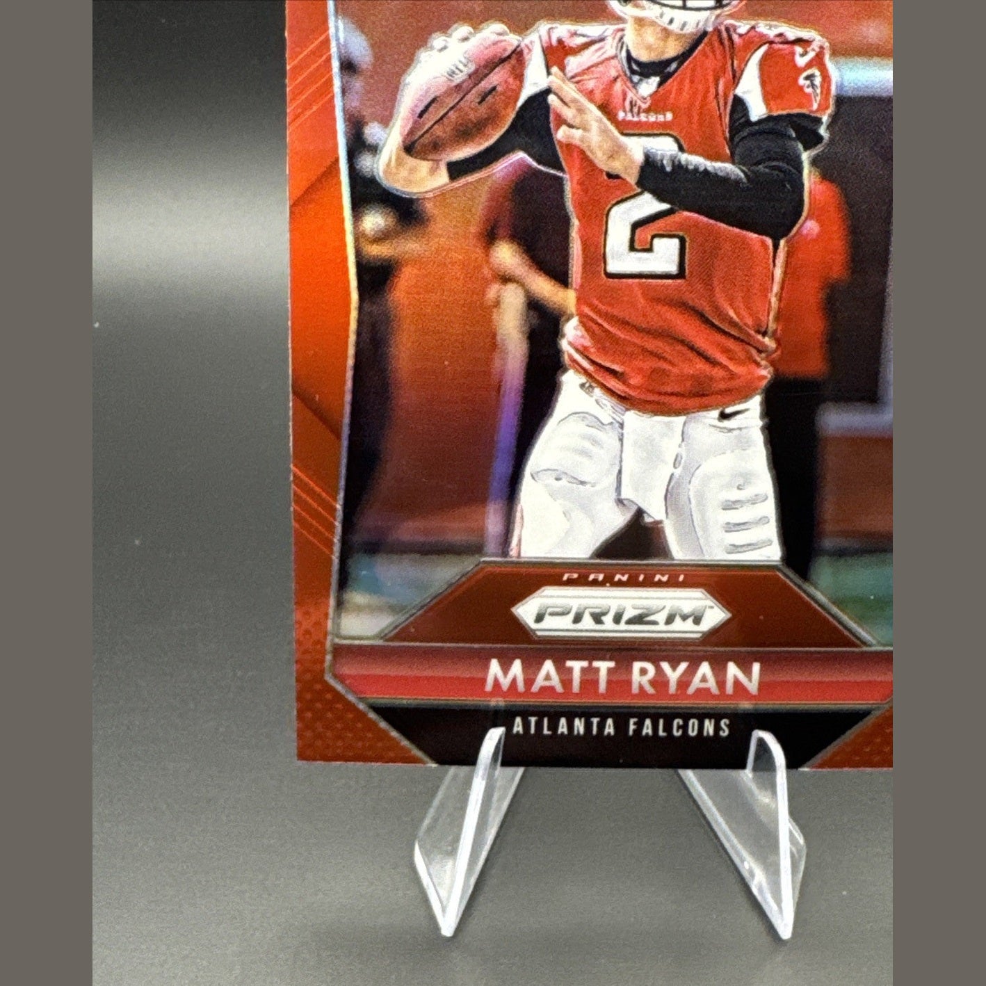 The product is a 2015 Panini Prizm Football Red Prizm trading card featuring Matt Ryan of the Atlanta Falcons. This original sports trading card is part of the Red Prizm insert set and is not autographed. It is a standard-sized card from the National Football League (NFL) season of 2015, manufactured by Prizm in the United States. The card is in English and is a unique parallel/variety within the Prizm brand, making it a desirable collectible for football fans and card enthusiasts.