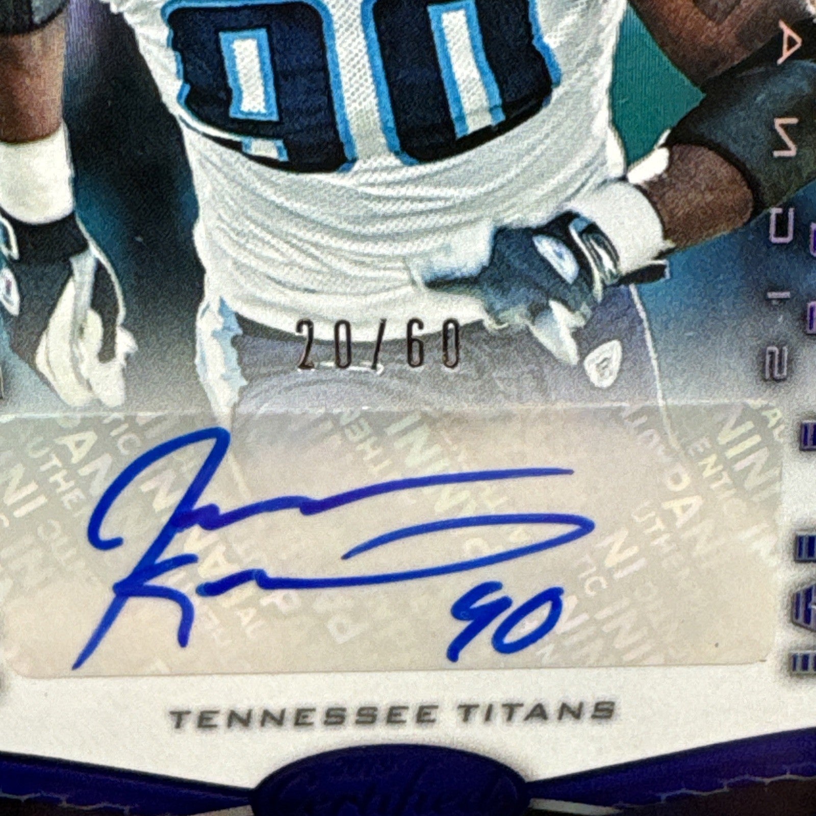 The 2019 Panini Certified - Signatures Jevon Kearse #MI-JK Mirror Blue 20/60 Auto trading card is a highly collectible item for fans of the Tennessee Titans and the National Football League. This autographed card features a label or sticker signature from Jevon Kearse, with a limited print run of 20 out of 60. Part of the 2019 Panini Certified set, this card is an original licensed reprint, making it a valuable addition to any football trading card collection. With its Mirror Blue parallel variety and Panini Authentic autograph authentication, this card is a must-have for collectors looking for a unique and rare piece.
