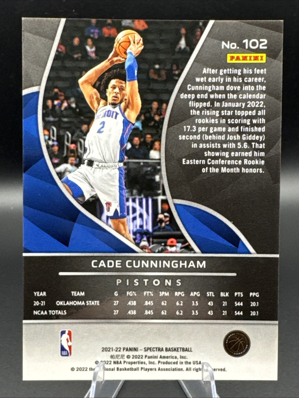 The 2021-22 Panini Spectra Cade Cunningham RC #102 Rookie Variation trading card features the promising NBA rookie from the Detroit Pistons. This authentic card, manufactured by Panini, is a part of the original Rookie Variation set for the 2021-22 season. Made of high-quality card stock, this English-language sports trading card showcases a standard size and a base parallel variety, making it a valuable addition to any basketball card collection. With its focus on a rising star like Cade Cunningham, this card is sure to be a sought-after item for fans and collectors alike.