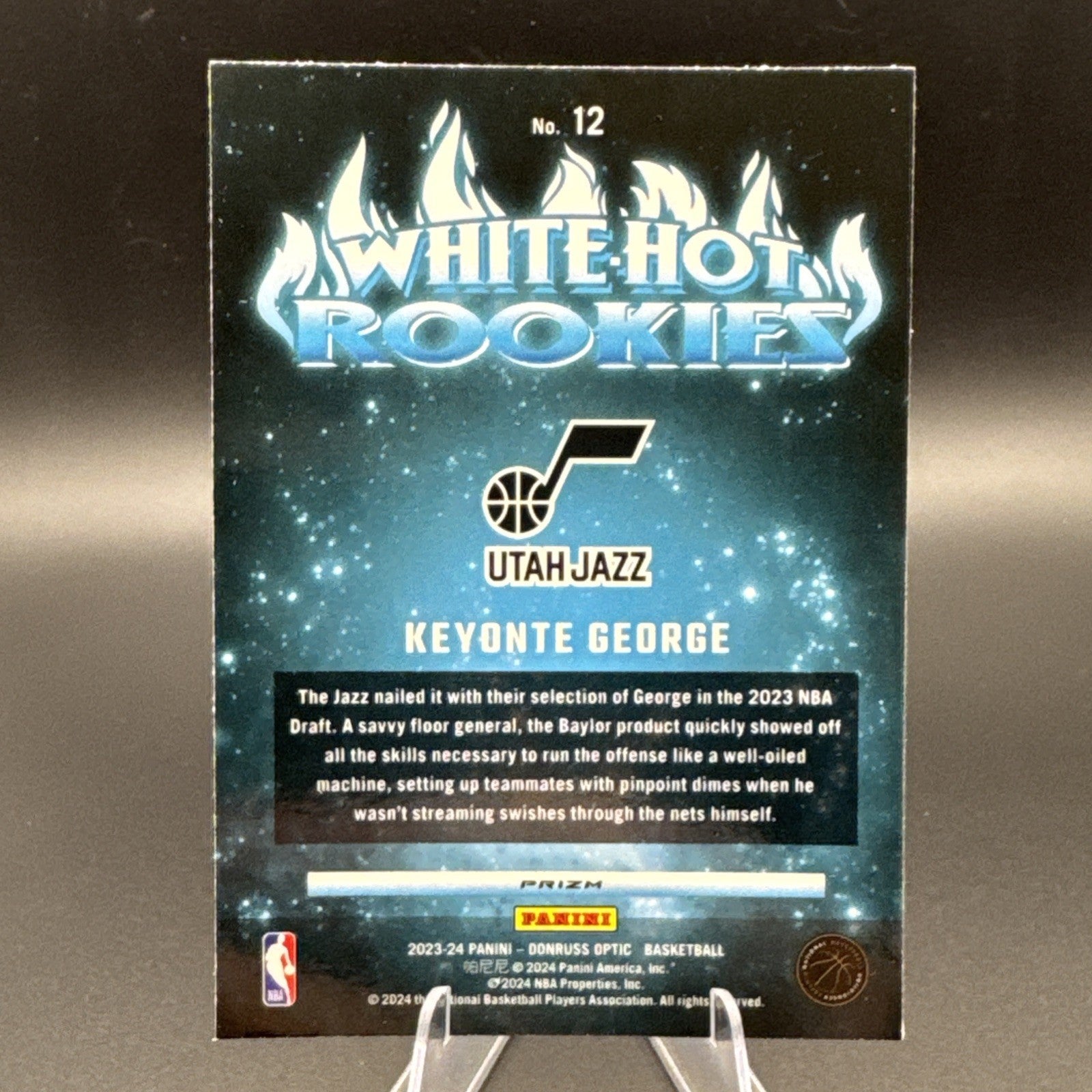 The product is a 2023-24 Donruss Optic Keyonte George Rookie Card featuring the player in his Utah Jazz uniform. This basketball trading card is part of the White Hot Rookies insert set, manufactured by Donruss. The card is not autographed and is labeled as card number 12 in the set, making it a highly sought-after collectible for NBA fans and trading card enthusiasts.