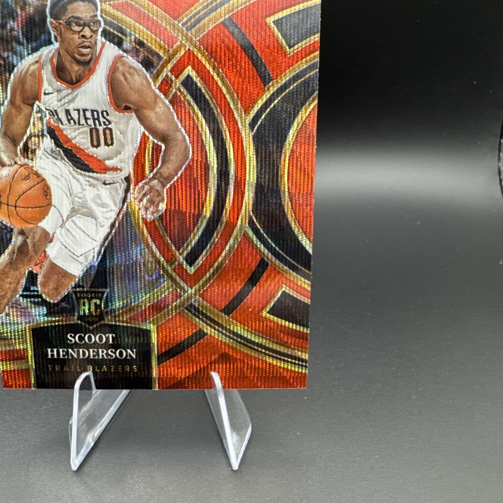 The product is a 2023-24 Scoot Henderson Panini Select Red Wave Premier RC #129 trading card. This card features the player Scoot Henderson from the Portland Trail Blazers in the National Basketball Association (NBA). It is a part of the 2023-24 Panini Select set and has a Red Wave parallel/variety design. The card is in English and showcases the standard size for trading cards in the sports memorabilia and trading card market. Without an autograph, this basketball trading card is a sought-after collectible for fans and collectors alike.