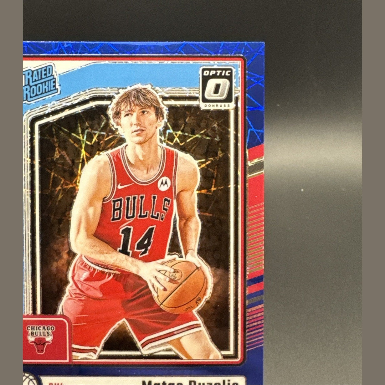 The product is a 2024-25 Donruss Optic Blue Velocity Rated Rookie trading card featuring Matas Buzelis of the Chicago Bulls in the NBA. This non-autographed card is part of the base set and is classified as a parallel/variety card. As a rated rookie card, it holds value for collectors and fans looking to add a piece of the upcoming star player's career to their collection. The Blue Velocity parallel adds a unique design element to the card, making it a sought-after item among basketball trading card enthusiasts.