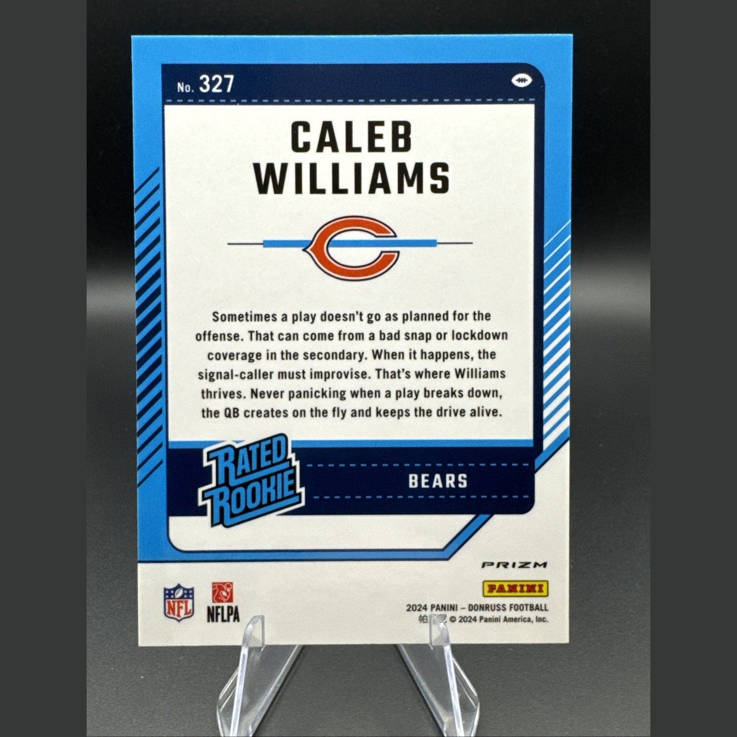 The product is a 2024 Panini Donruss Caleb Williams Optic Preview Red Green RC Rated Rookie trading card featuring the player from the Chicago Bears. This card is a base set with a parallel variety design, specifically the Optic Preview Red & Green Prizm. As a rookie card, it holds value for collectors and fans of the National Football League (NFL) looking to add a unique piece to their memorabilia collection. The card number is 327, reflecting its position within the set for the 2024 season.