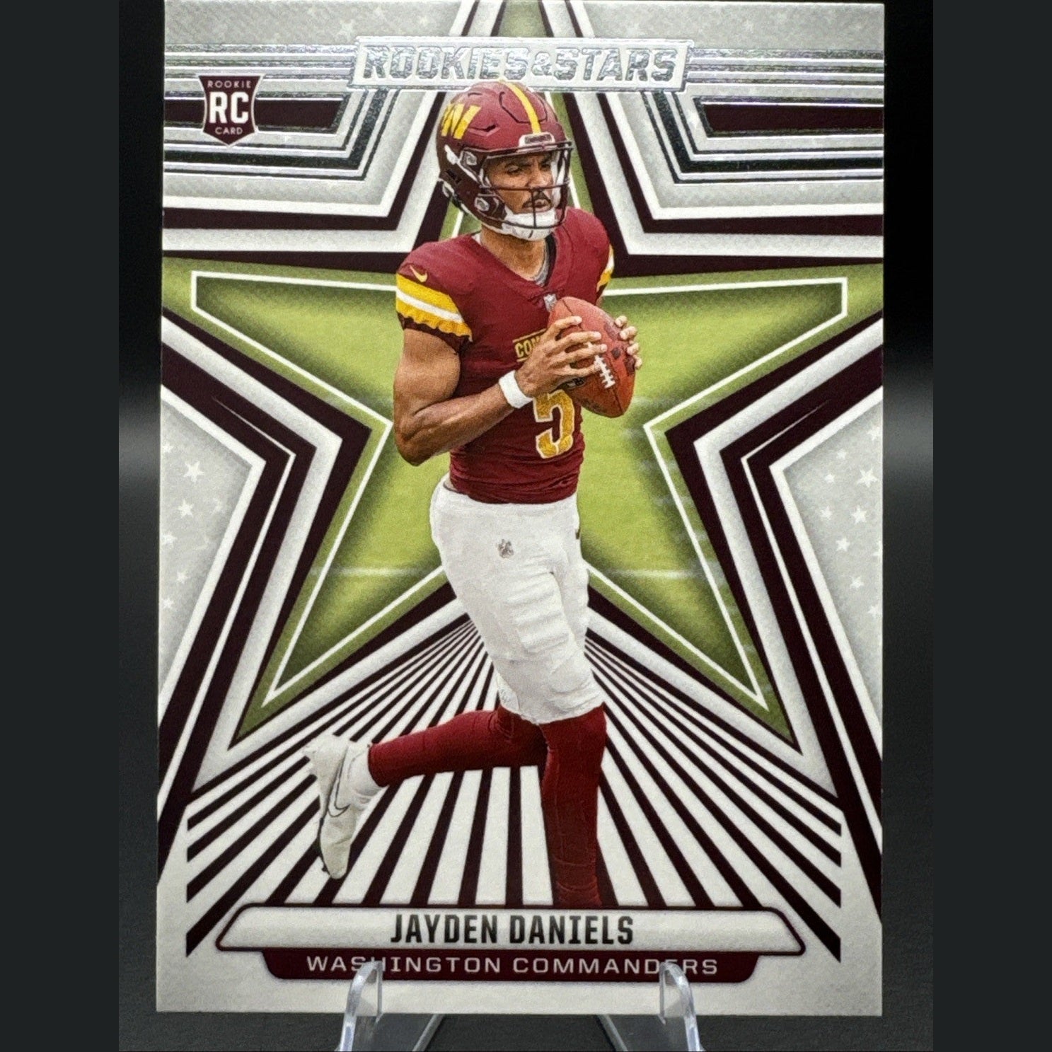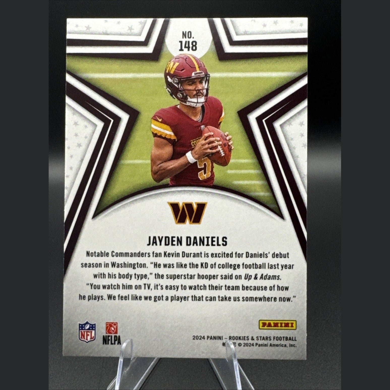 The product is a 2024 Panini NFL Rookies & Stars trading card featuring Jayden Daniels, a rookie player for the Washington Commanders in the National Football League. This sports trading card is part of the 2024 Panini set and is numbered 148. As a collectible item, it appeals to fans and collectors looking to add a piece of memorabilia from the upcoming NFL season to their collection. With the focus on a promising rookie player like Jayden Daniels, this card is sure to be a sought-after item among football trading card enthusiasts.