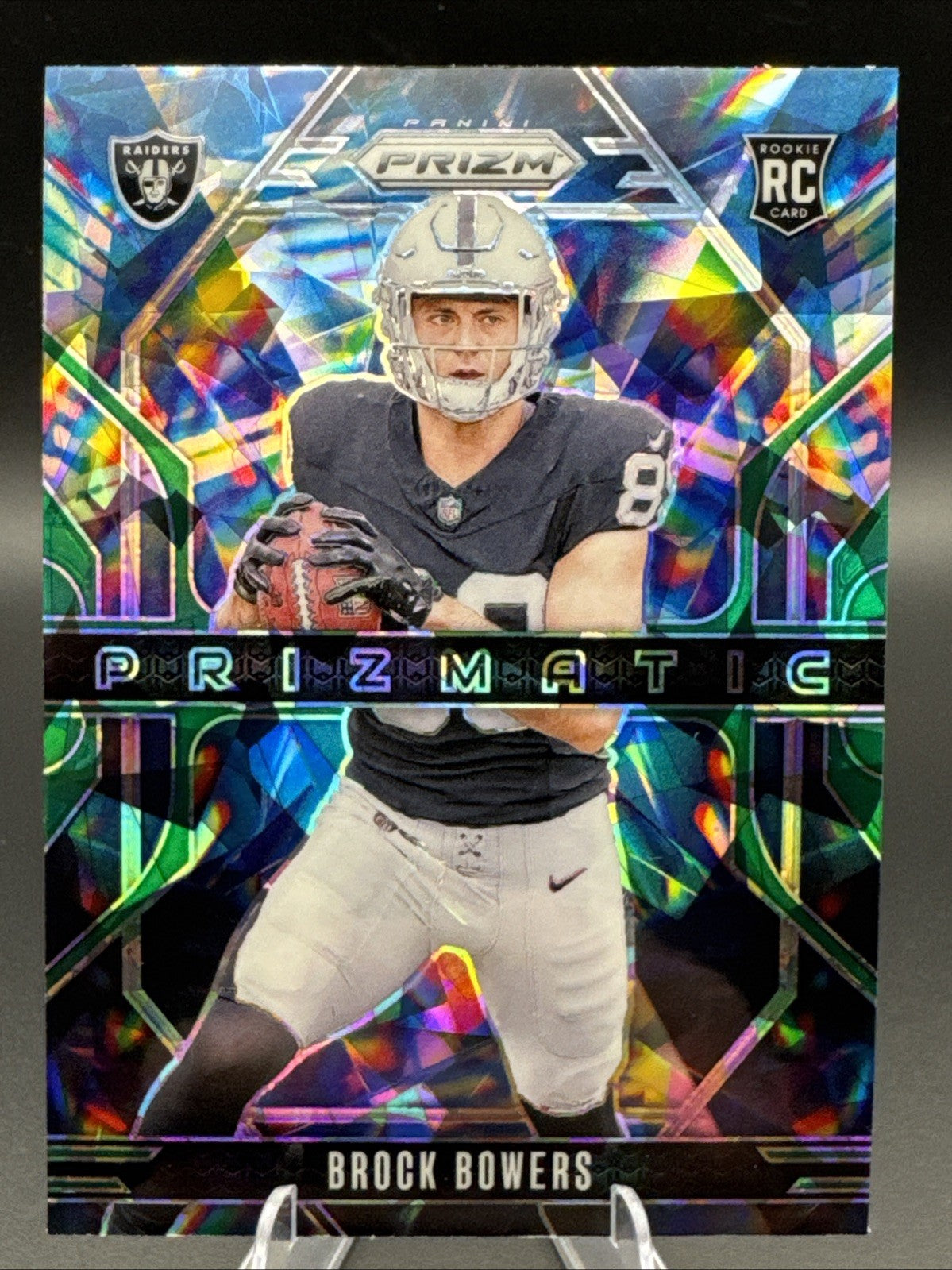 The 2024 Panini Prizm - Prizmatic Green Prizm #20 Brock Bowers (RC) trading card features the rookie athlete from the Las Vegas Raiders, Brock Bowers. This football card is part of the 2024 Panini Prizm set and is a special Green Prizm parallel variety with a distinctive design. The Prizmatic insert set highlights promising players like Bowers, making it a valuable addition to any sports trading card collection for fans of the National Football League (NFL).