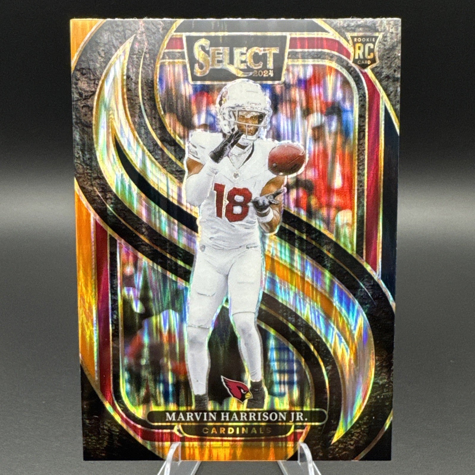 The 2024 Panini Select Premier Level Marvin Harrison Jr Black & Red Shock Prizm #115 trading card is a sought-after collectible for football fans and card enthusiasts. This original card features a striking design with a Black & Red Shock Prizm parallel variety, making it a unique and desirable addition to any collection. Manufactured by Panini, this card is part of the 2024 Panini Select set and showcases the talented player Marvin Harrison Jr. from the Arizona Cardinals. Made of sturdy card stock material with a 20 Pt. thickness, this card is a must-have for fans of the National Football League.