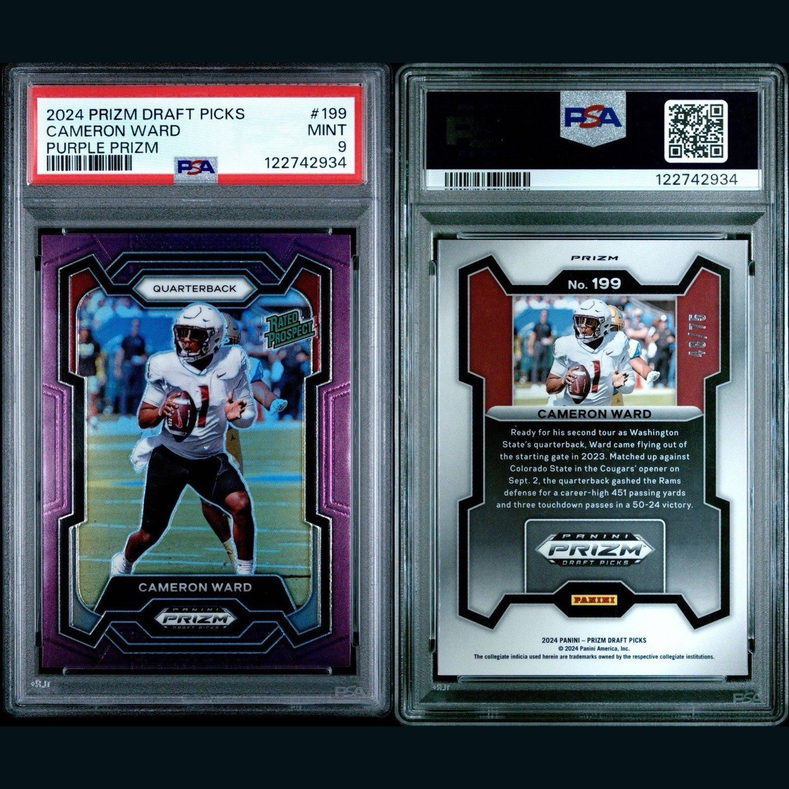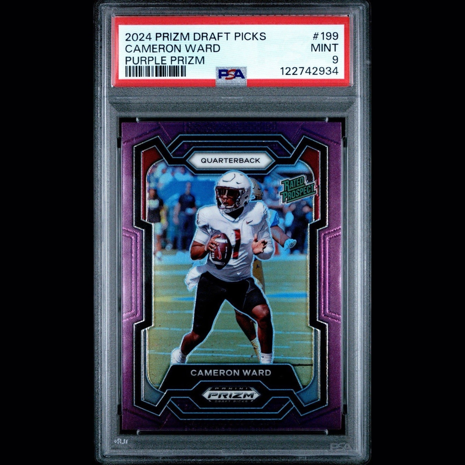 2024 Prizm Draft Picks Cam Ward Purple Prizm #'d 48/75 Rated Prospect #199 PSA 9