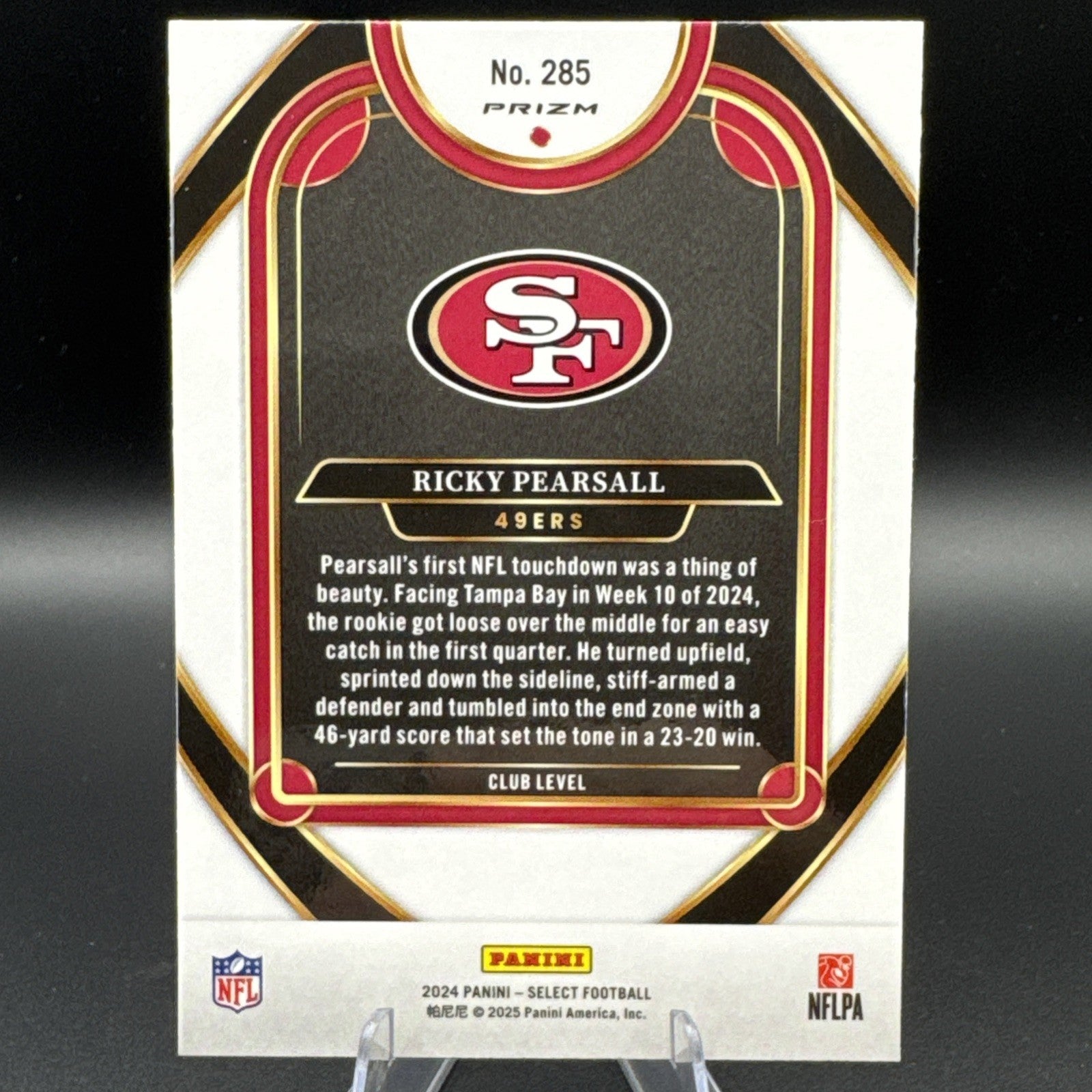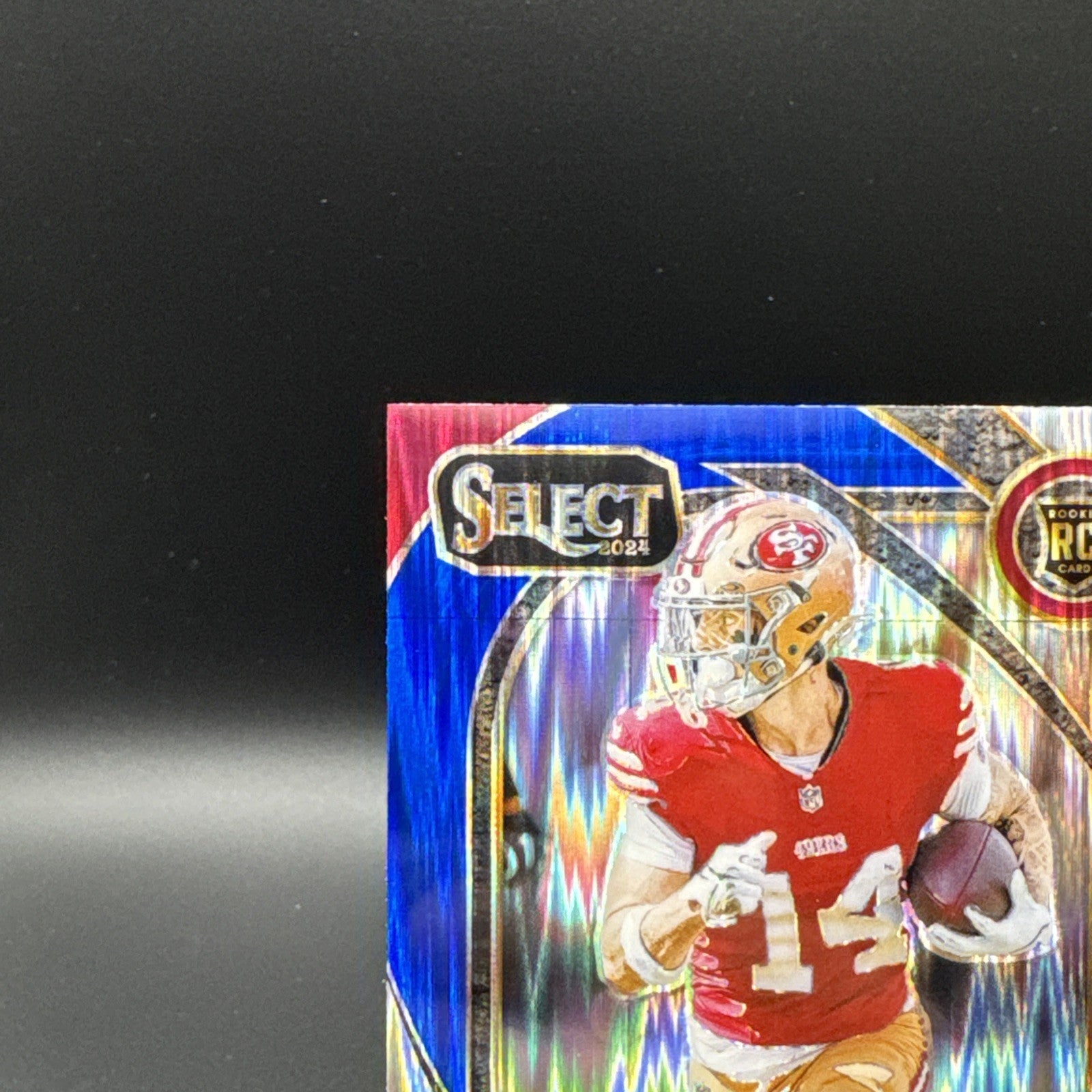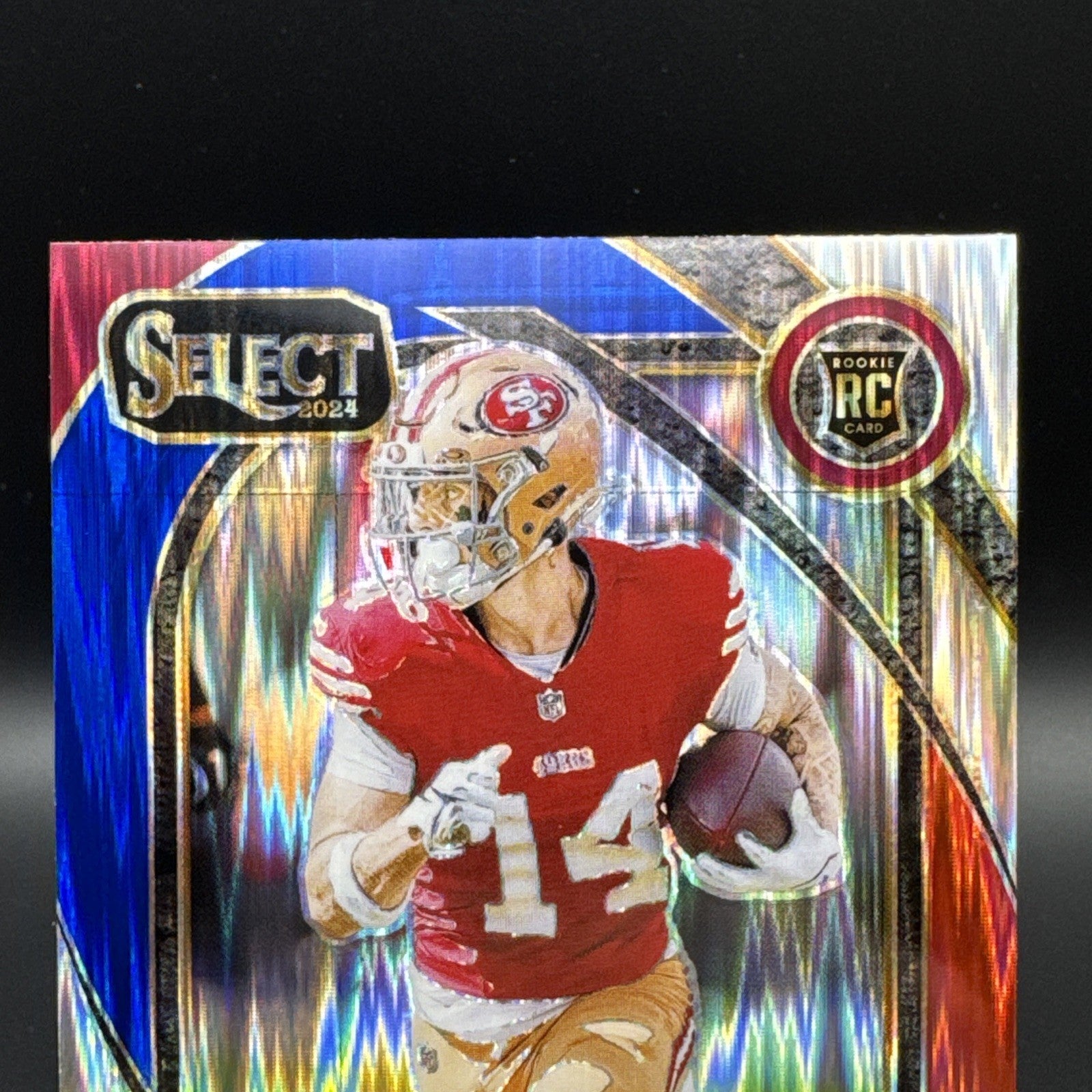 The 2024 Ricky Pearsall Panini Select Club Level Red & Blue Shock Prizm #285 RC is a standard-sized trading card featuring the rookie player Ricky Pearsall from the San Francisco 49ers. Manufactured by Panini, this original card is part of the 2024 Panini Select set and is in English language. It is a parallel variety card with a distinct red and blue shock prizm design, making it a unique addition to any football card collection. With no autograph included, this card is perfect for fans of the National Football League looking to collect rookie cards of promising players like Pearsall.