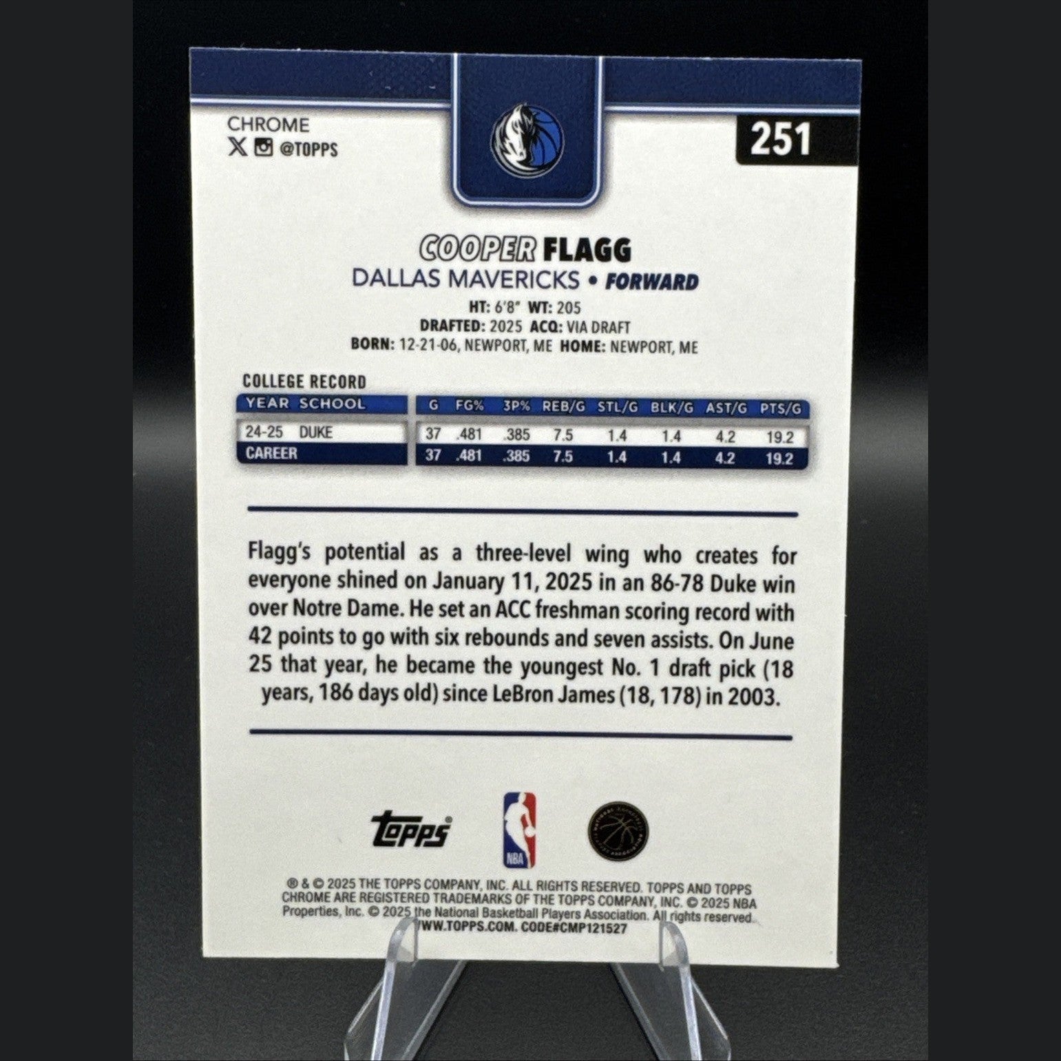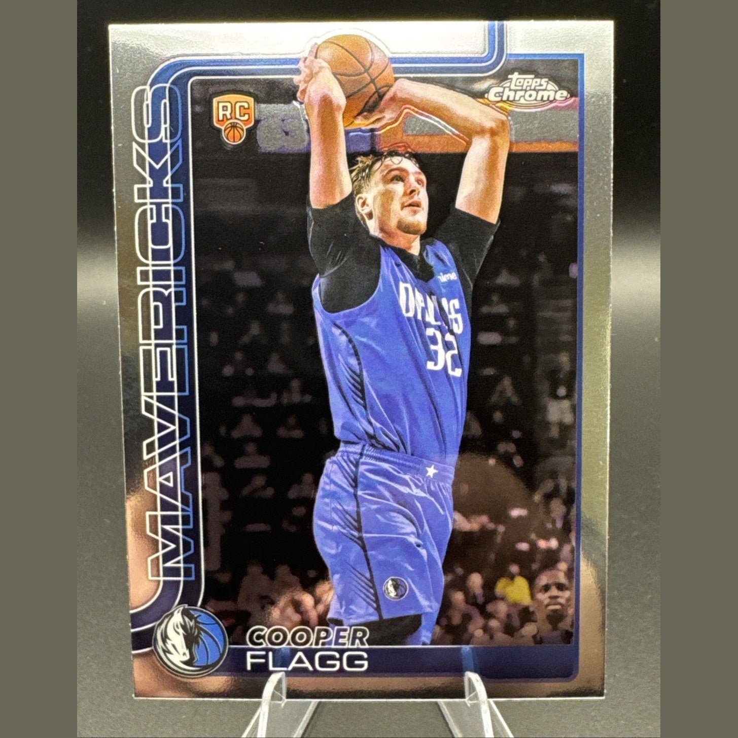 The 2025-26 NBA Topps Chrome Cooper Flagg RC Dallas Mavericks Base Rookie #251 is a standard-sized sports trading card featuring basketball player Cooper Flagg from the Dallas Mavericks. This original, English-language card is part of the 2025-26 Topps Chrome set, with a chrome finish and made of 20 Pt. card stock. It is a rookie card for the upcoming NBA season, manufactured by Topps in the United States. Perfect for basketball fans and collectors looking to add a piece of the 2025-26 NBA season to their collection.