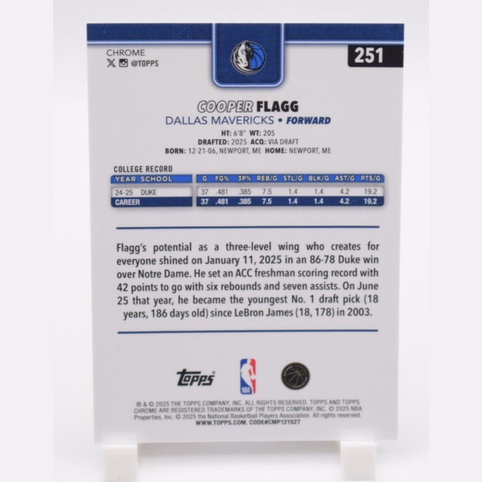 The product is a 2025-26 Topps Chrome trading card featuring Cooper Flagg, a rookie player for the Dallas Mavericks in the National Basketball Association (NBA). The card is made of 20 Pt. card stock and is an original edition in English language. It is part of the base set and is not vintage, with a focus on the NBA Finals event. The card is numbered 251 in the set and is a valuable addition for basketball card collectors looking to add a piece of memorabilia from the 2025-26 season to their collection.