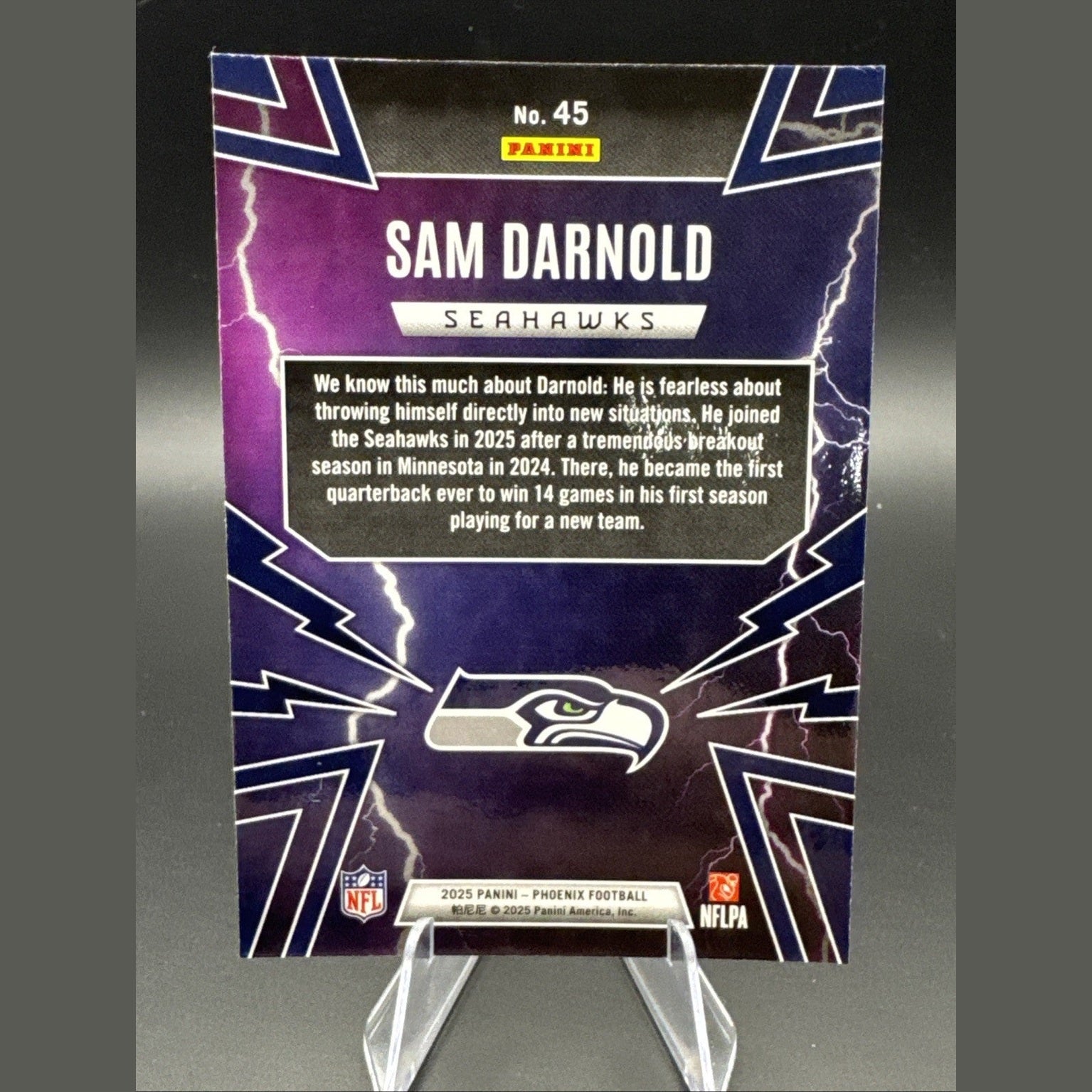 The product is a 2025 Phoenix trading card featuring Sam Darnold of the Seattle Seahawks. Manufactured by Panini as part of the Thunderbirds insert set, this card is a single from the 2025 NFL season. With a card number of 45, it is a collectible item for fans of football and trading cards, showcasing the athlete in a unique and limited edition design.