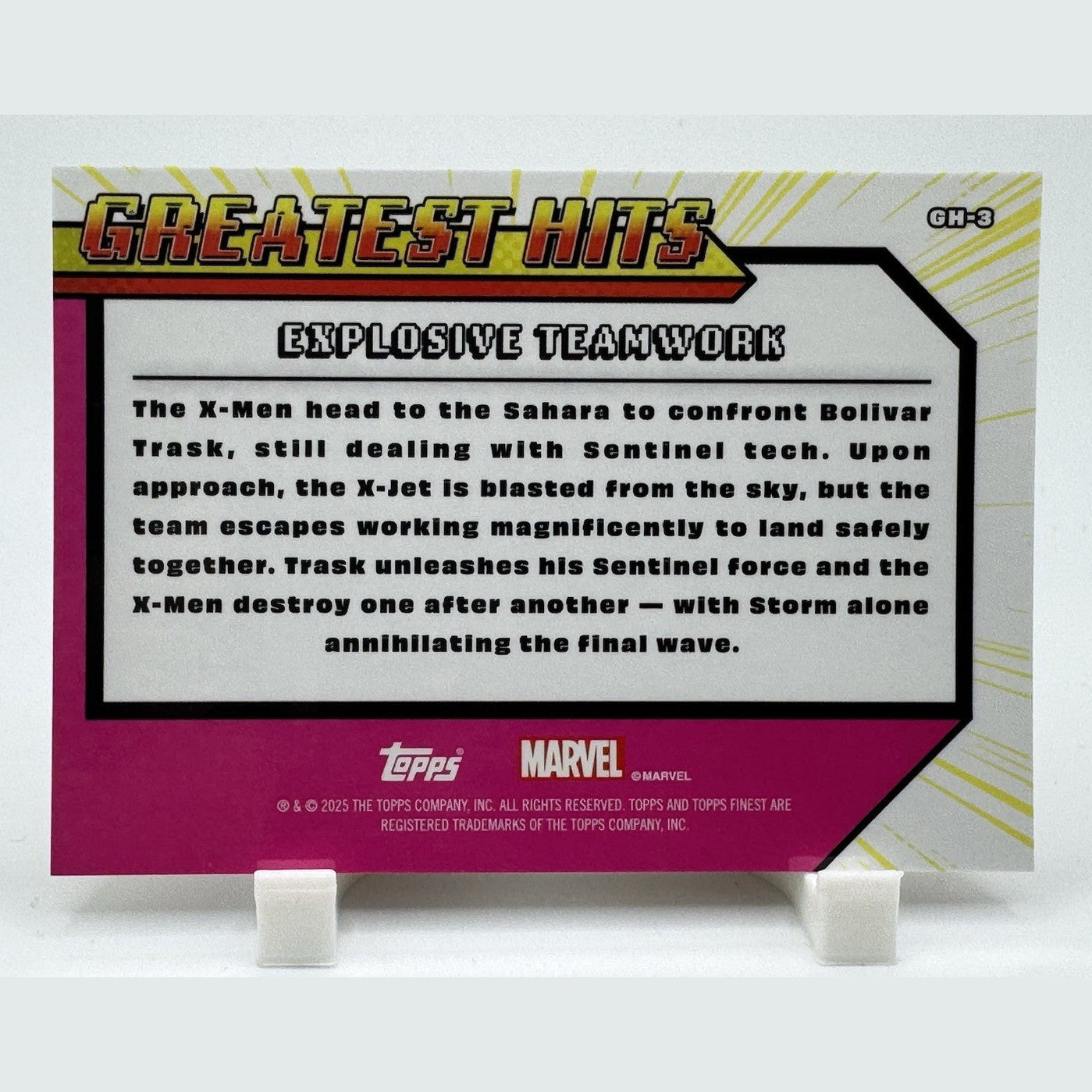 The 2025 Topps Finest Marvel X-Men 97 Teamwork Wolverine Gambit #GH-3 GOLD /50 trading card is a rare and collectible item, featuring two popular X-Men characters, Wolverine and Gambit. This card is part of the Greatest Hits insert set, with a limited print run of only 50 copies. Made of card stock and featuring a Gold Refractor parallel variety, it is a valuable addition to any Marvel or X-Men trading card collection. Produced by Topps, this original card is serial numbered and includes special features that make it a sought-after item for fans of superhero and action genres.