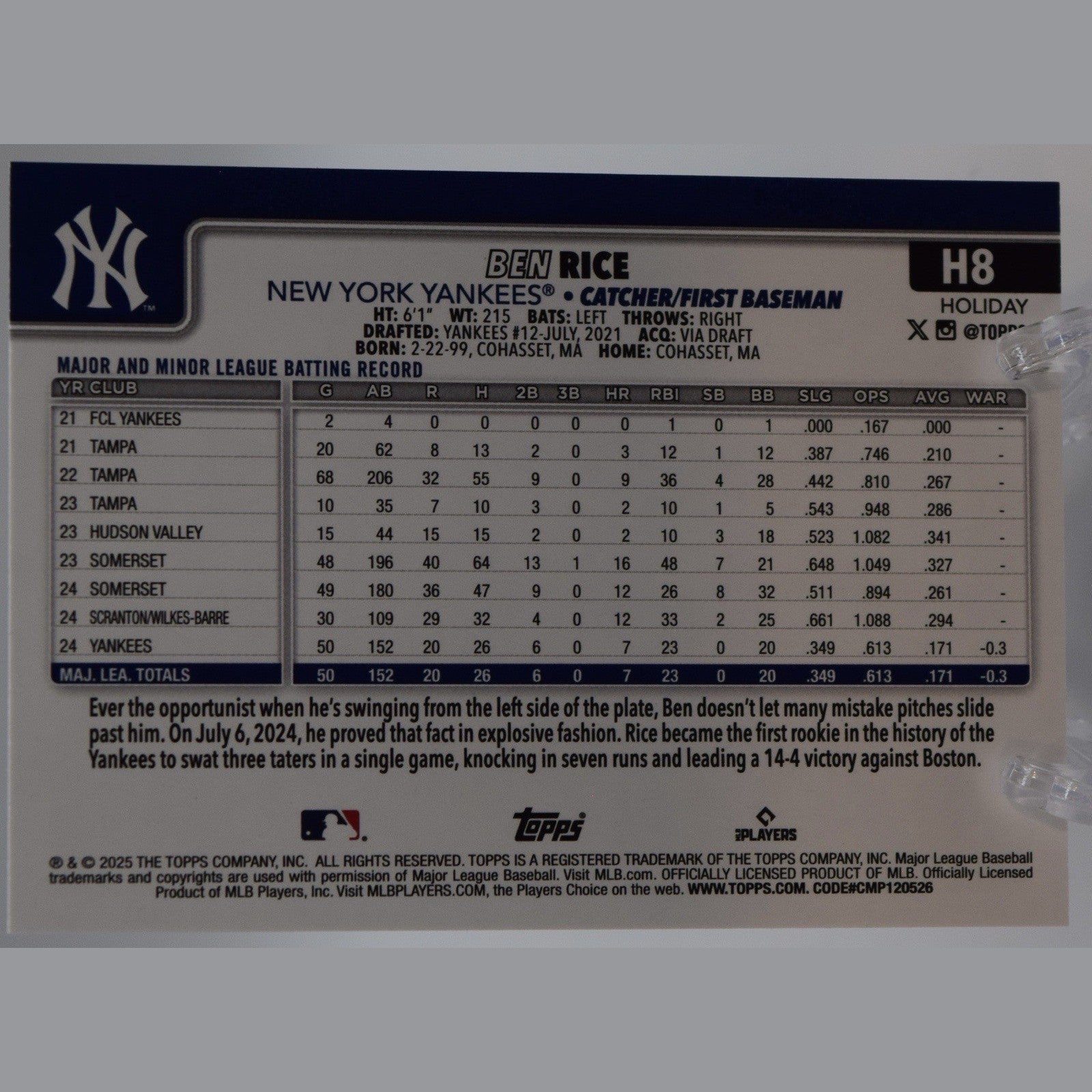The 2025 Topps Holiday Ben Rice (RC) #H8 trading card is a standard-sized baseball card featuring the rookie player Ben Rice from the New York Yankees. This original card is manufactured by Topps and is part of the 2025 Topps Holiday set, made of 20 Pt. card stock. The card is in English and does not come autographed, making it a great addition to any sports trading card collection for fans of the MLB and the New York Yankees.