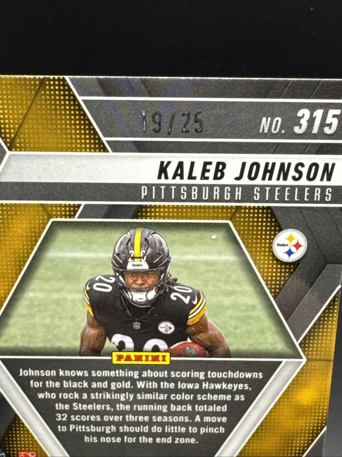 The product is a 2025 Panini Mosaic #315 Kaleb Johnson Rookie Auto White Prizm trading card. This card features an autograph from Kaleb Johnson, signed on a label or sticker, and belongs to a limited print run of 19 out of 25. It is part of the Rookie Autographs White Prizm variety and is authenticated by Panini Authentic. The card is from the NFL league and showcases Kaleb Johnson as a player for the Pittsburgh Steelers. A valuable addition to any sports trading card collection, this card captures a significant moment in the rookie career of a promising athlete.