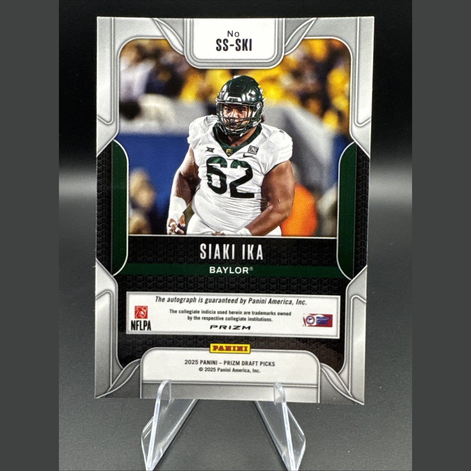The product is a 2025 Panini Prizm Draft Picks Sensational Signatures Green trading card featuring an autograph from Siaki Ika of the Baylor Bears football team. This card, authenticated by Panini Authentic, is part of the 2025 Panini Prizm Draft Picks set and is sure to be a valuable addition to any sports trading card collection. With its unique autograph format and limited green parallel variety, this card is a special and sought-after item for fans and collectors alike.