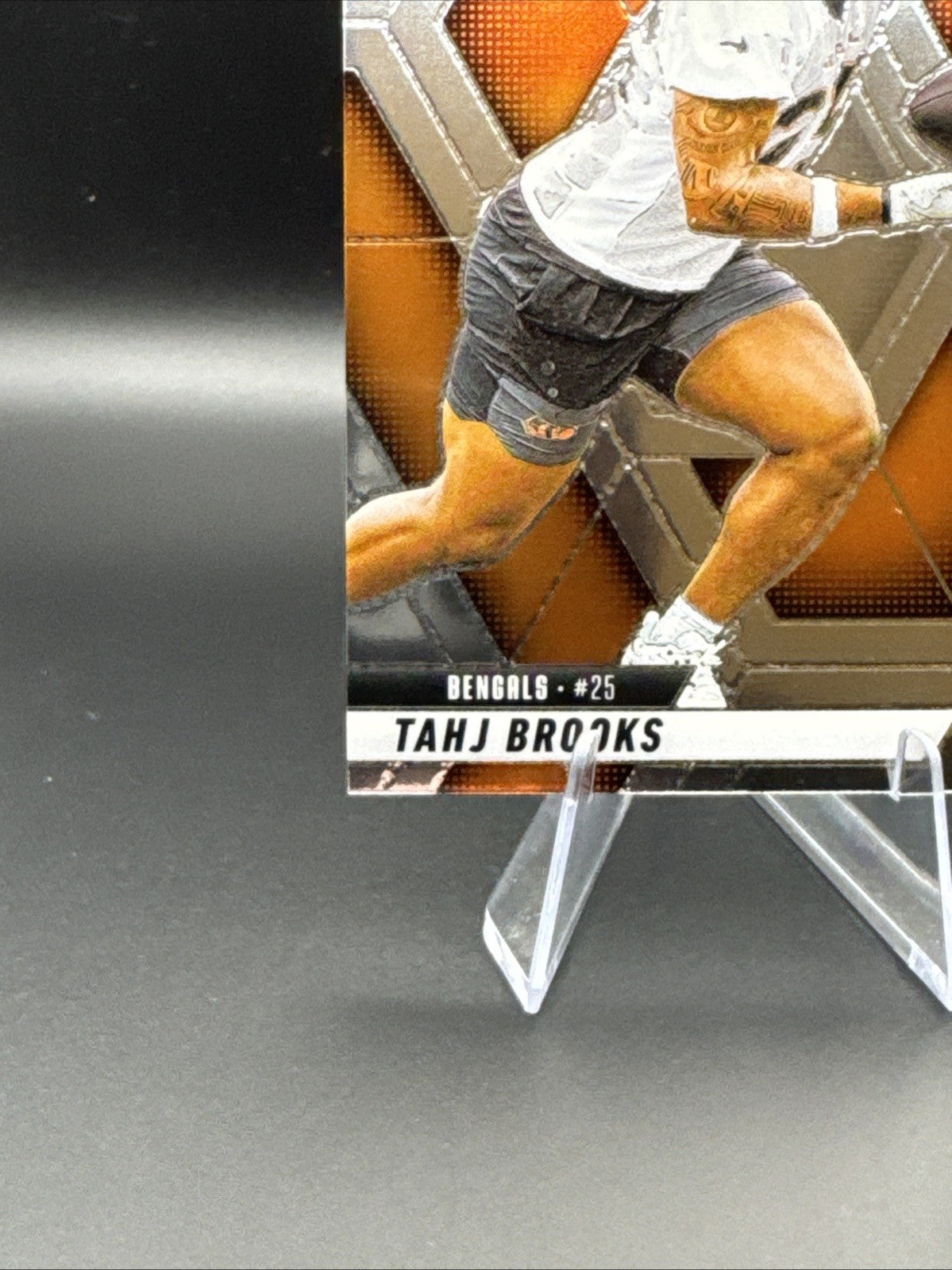 The product is a Tahj Brooks 2025 Panini Mosaic Rookie Base #400 trading card featuring the Cincinnati Bengals. This football trading card is part of the 2025 Panini set and is a parallel/variety known as Mosaic. As a rookie card, it holds significance for collectors looking to add a piece of the player's early career to their collection. The card number 400 indicates its specific placement within the set, making it a sought-after item for fans of the Cincinnati Bengals and football trading card enthusiasts.